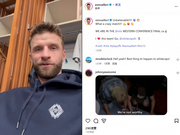 他也在赛后通过社媒追念晋级:“难以置信!!!! ⚽️😁何等荒诞的一场比赛!!! 💪😄👏咱们晋级西部决赛了👍🏼我❤️这支球队!加油, @温哥华白浪🔝”
