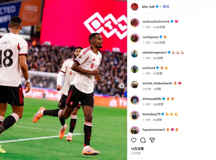 伊萨克也在赛后通过社媒晒出了我方的比赛照,但并未附加翰墨本色。索博斯洛伊、琼斯等队友现身挑剔区留住色调标志以作饱读动。