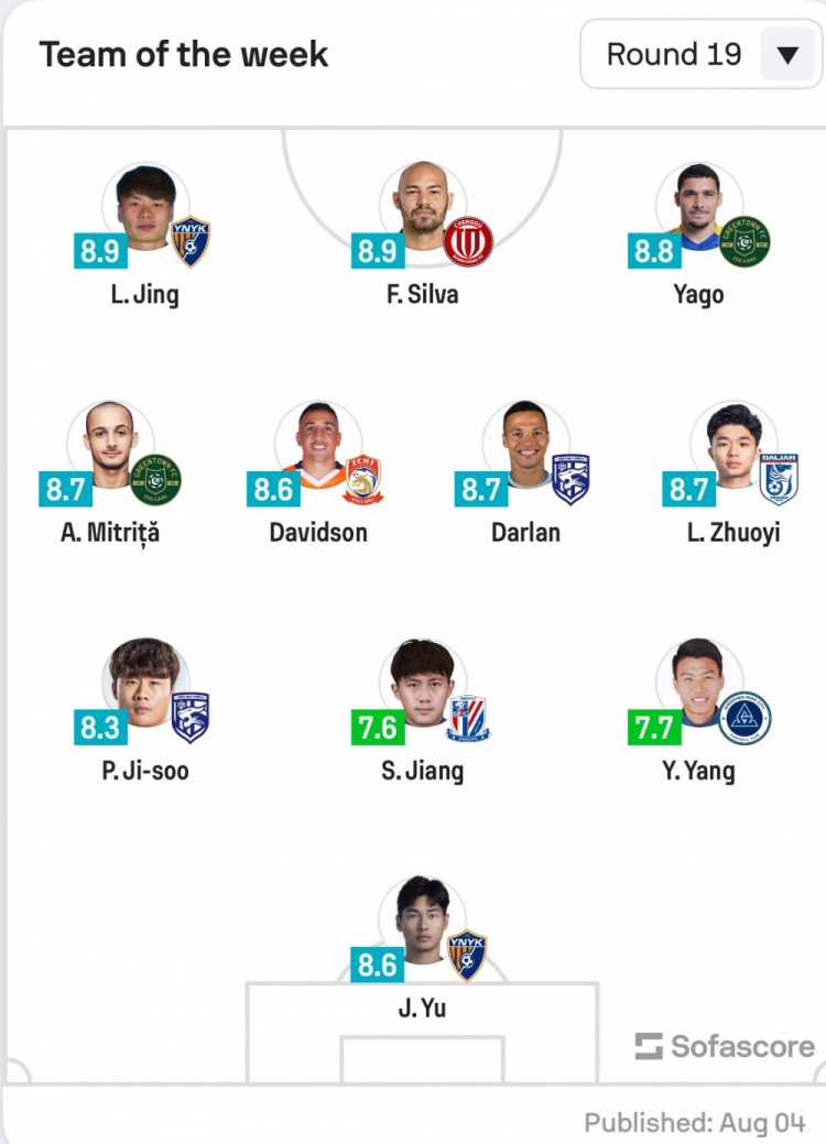 数据平台Sofascore对本轮中超最好球员进行评比,其中玉昆、三镇和浙江队各有2将入选,米特里策、费利佩等入选。