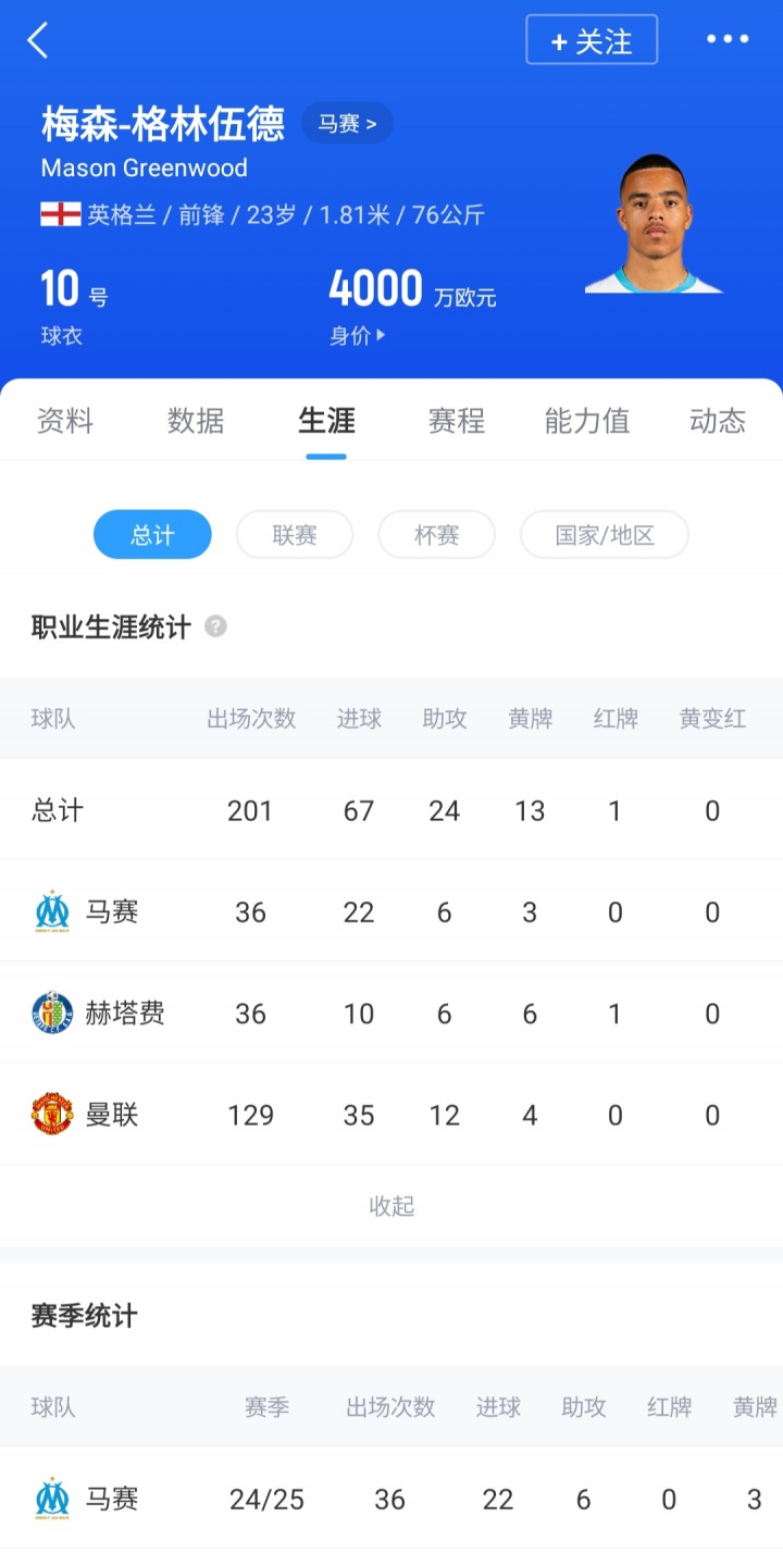 23岁的格林伍德,上赛季代表马赛出战36场比赛,孝敬22球6助,现时球员德回身价4000万欧。
