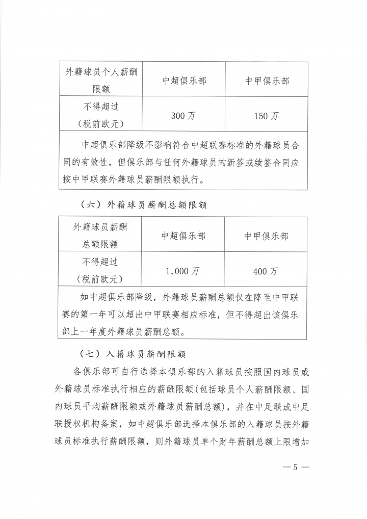 外籍球员薪酬总名额分辩为1000万税前欧元(中超)和400万税前欧元(中甲)