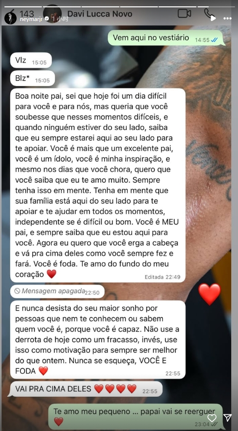 卢卡发给内马尔的信息:爸爸,我知说念今天对你和咱们来说齐是粗重的一天。但我念念让你知说念,在这些贫穷时辰,即使莫得东说念主站在你身边,我也会一直陪同着你支撑你。你不仅是一位优秀的父亲,更是我的偶像和灵感起首。