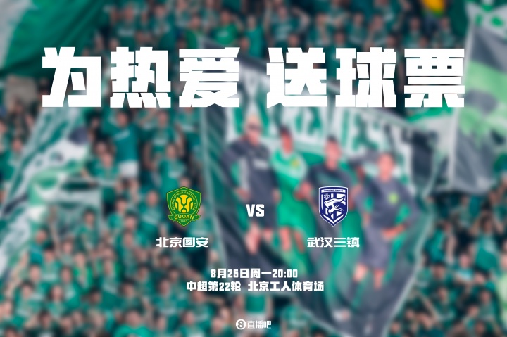 8月25日下周一20:00,中超第22轮北京国安镇守主场对阵武汉三镇,小吧不息为吧友带来球票福利!