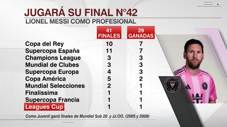 据ESPN数据统计,在梅西的事业球员的生活中,共干涉了41场决赛,得到了其中的29场。