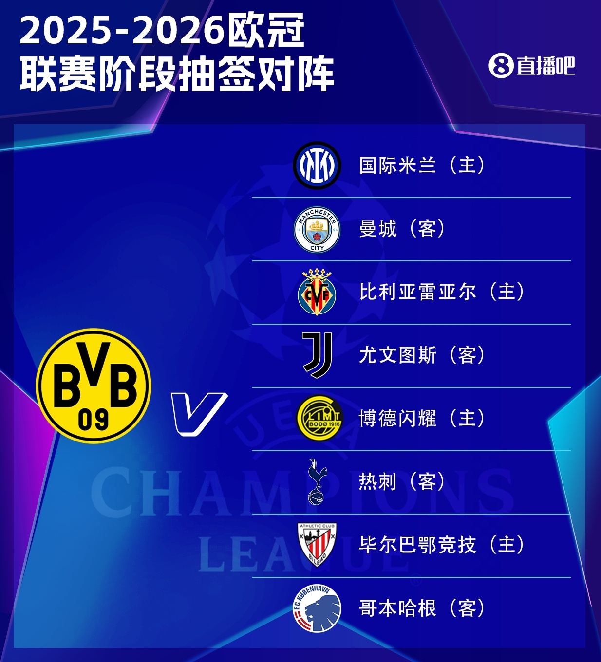 8月29日讯 2025/26赛季欧冠抽签服从出炉,联赛阶段多特将和曼城、国米、尤文、热刺、黄潜等交手。