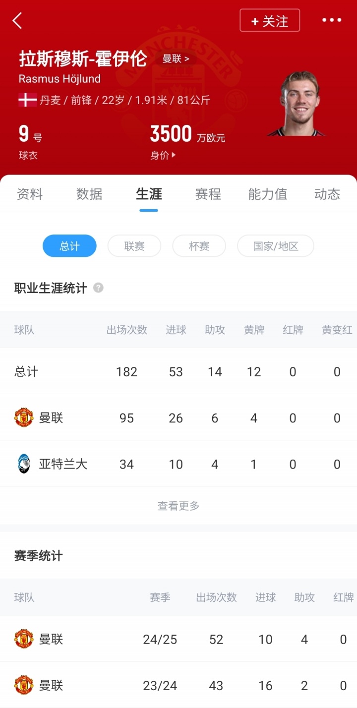 霍伊伦现年22岁,曼联2023年夏天破钞7780万欧从亚特兰大引进霍伊伦。在曼联的两个赛季,霍伊伦共代表球队出战95场比赛,孝敬26球6助攻。当今,霍伊伦的德回身价为3500万欧。
