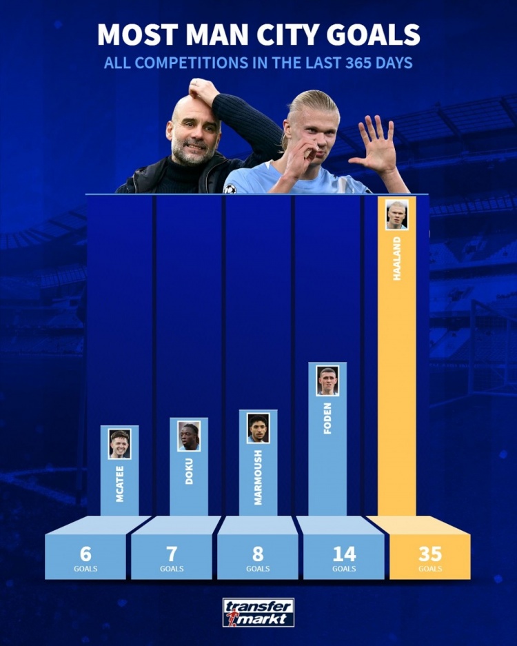10月7日讯 德国转会市集列出了当年一年曼城队内的弓手榜,哈兰德35球断层居首。