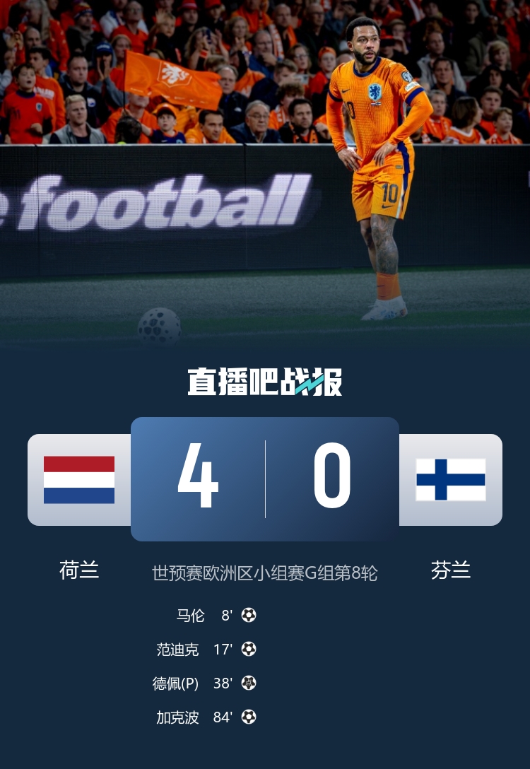 德佩点射+助攻双响,马伦天下波,范迪克、加克波立功;荷兰6轮不败领跑G组。