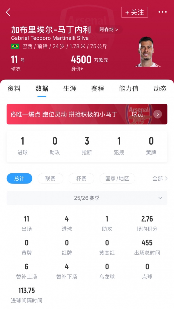 10月22日讯 本轮欧冠阿森纳主场4-0完胜马竞,先发登场的马丁内利精彩推射打入球队第二球,欧冠三轮仍是有三粒进球入账,本赛季共计打入4球仅次于队友约克雷斯。