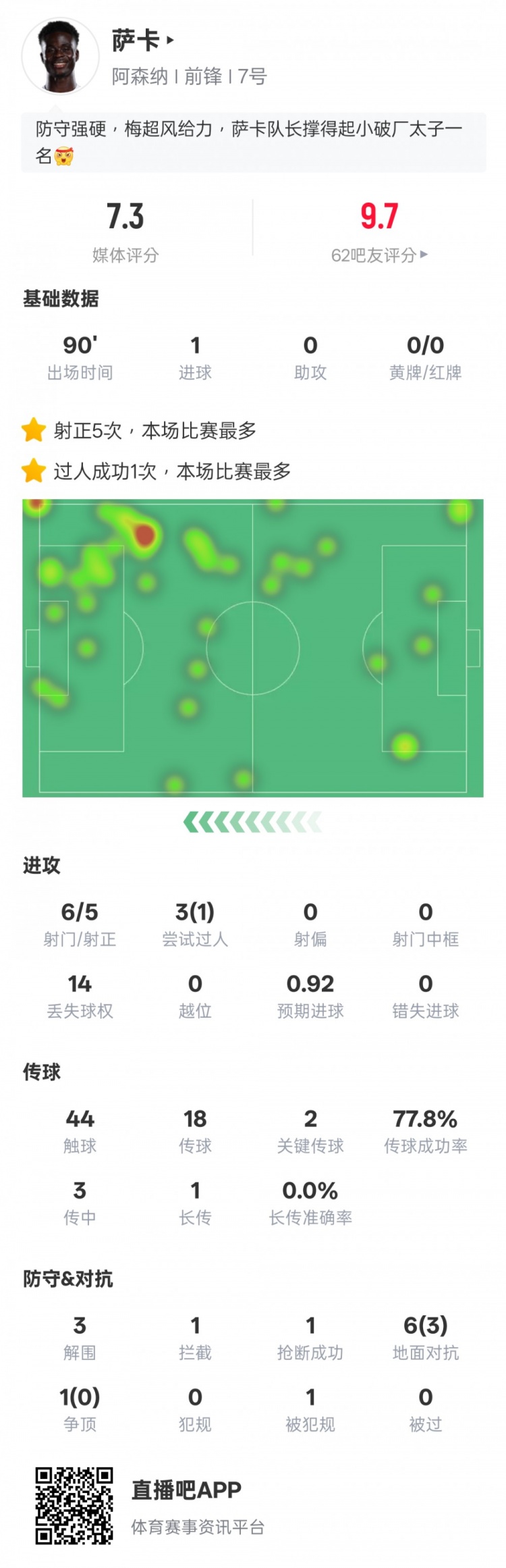 萨卡本场比赛具体数据如下: