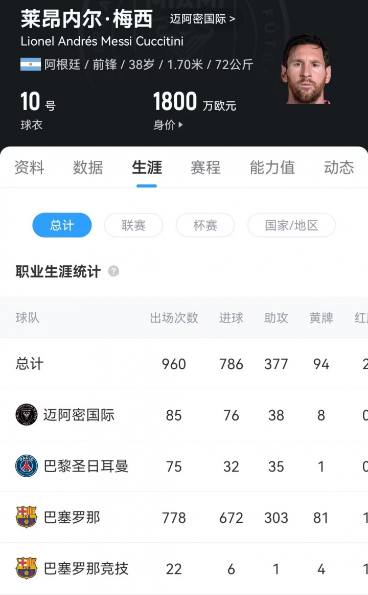据统计,这粒进球是梅西个东谈主劳动生活的第895粒进球(不同机构的统计神态有进出),梅西距离我方劳动生活的900球大关仅有5球差距。