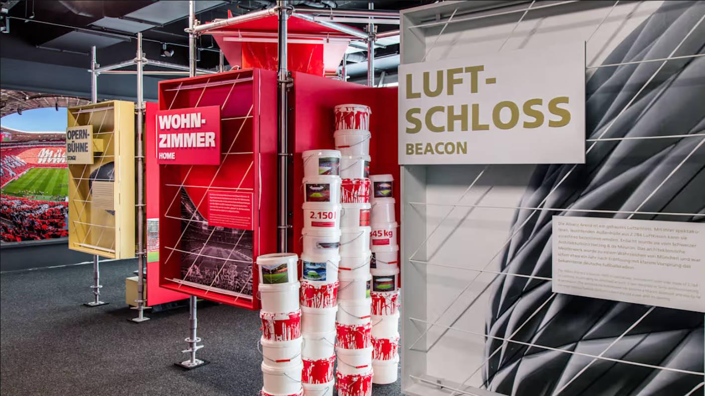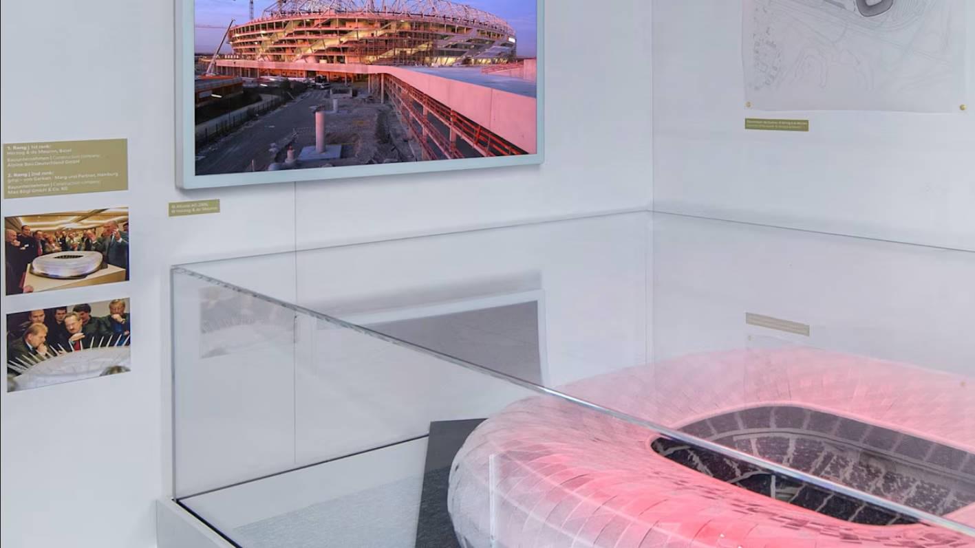 一段纪录建筑经由的影片以及无边轰动展品,如基石复成品、发光的球场模子和球场外墙气垫的复刻品,灵活地向不雅众展现了安联球场奈何从一个“空中楼阁”的构思调动为建筑界的经典之作。