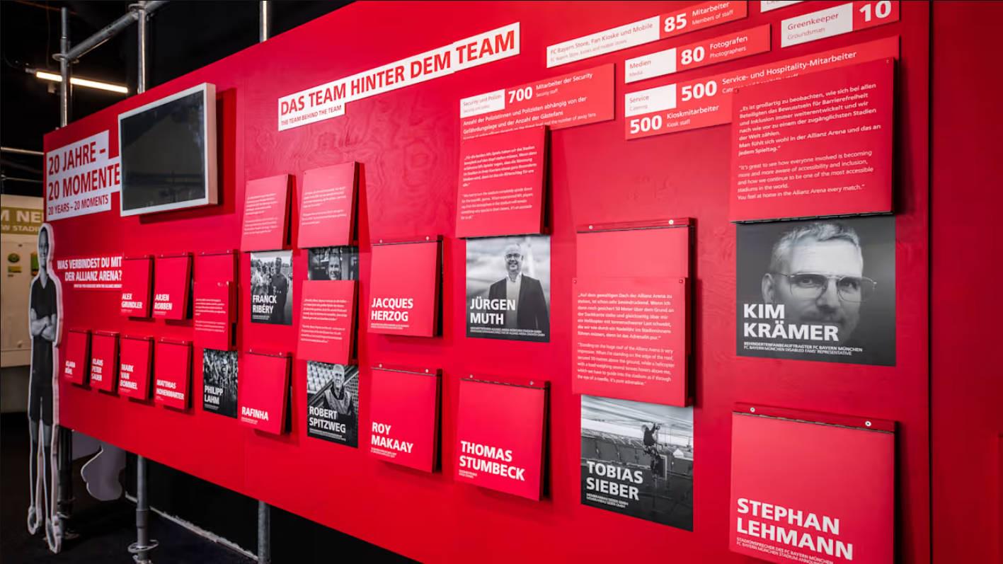 展览的“客厅”部分展示了球场的正常运作,同期将那些在已往20年间让安联球场成为俱乐部人人著名主场的东说念主们置于中,:一方面是球迷,他们的大型攀附图案和歌声不错通过专属展区体验;另一方面则是球员、有野心者和责任主说念主员,他们共享了在球场运营20年间所资格的谨记时分。