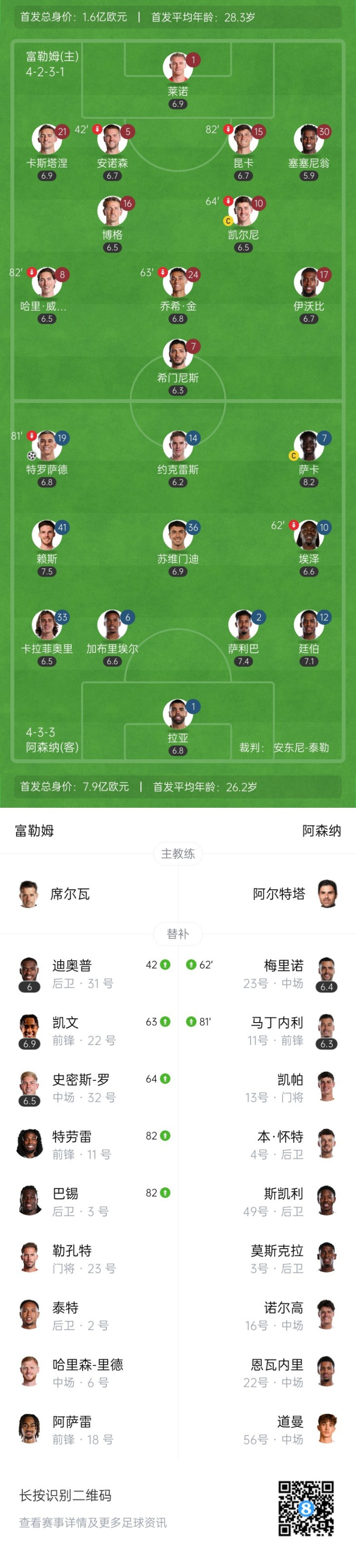 全场比赛摈弃,最终阿森纳1-0富勒姆。