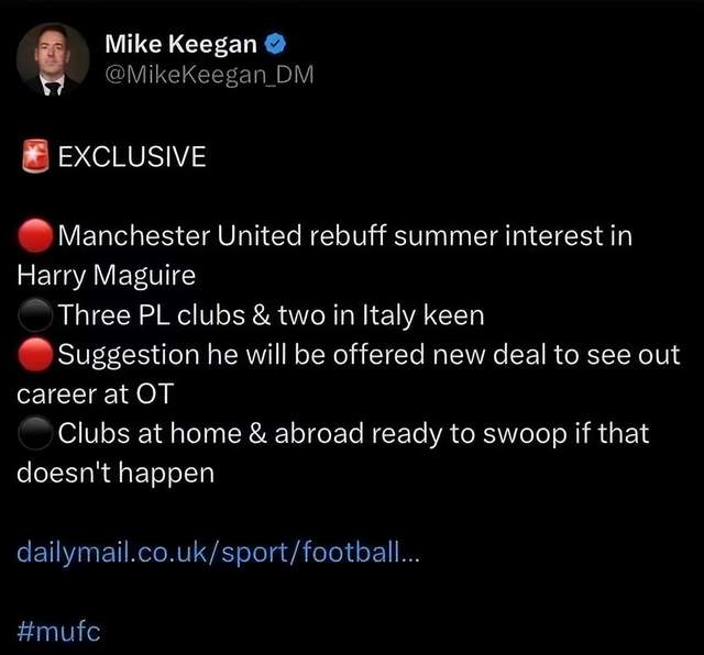 跟队记者 Mike Keegan 独家报说念,曼联夏窗终止多份求购哈里-马奎尔的报价,包括三家英超俱乐部和两家意甲俱乐部。