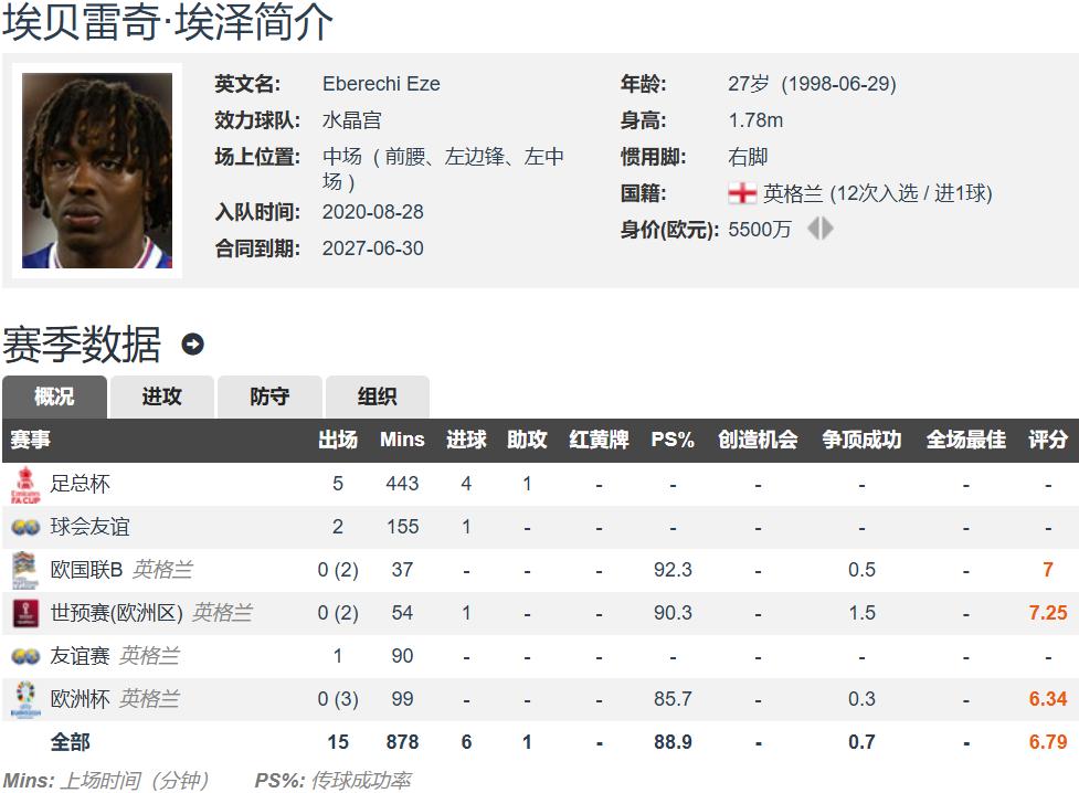 埃泽现年27岁,英格兰球员,习用脚是右脚,能踢前腰、左边锋以及左中场,与水晶宫的协议至2027年,德转估价5500万欧元。埃泽上赛季各项赛事共为水晶宫出场43次,其中40次首发,所有出场3303分钟,孝顺14球11助,准两双数据。