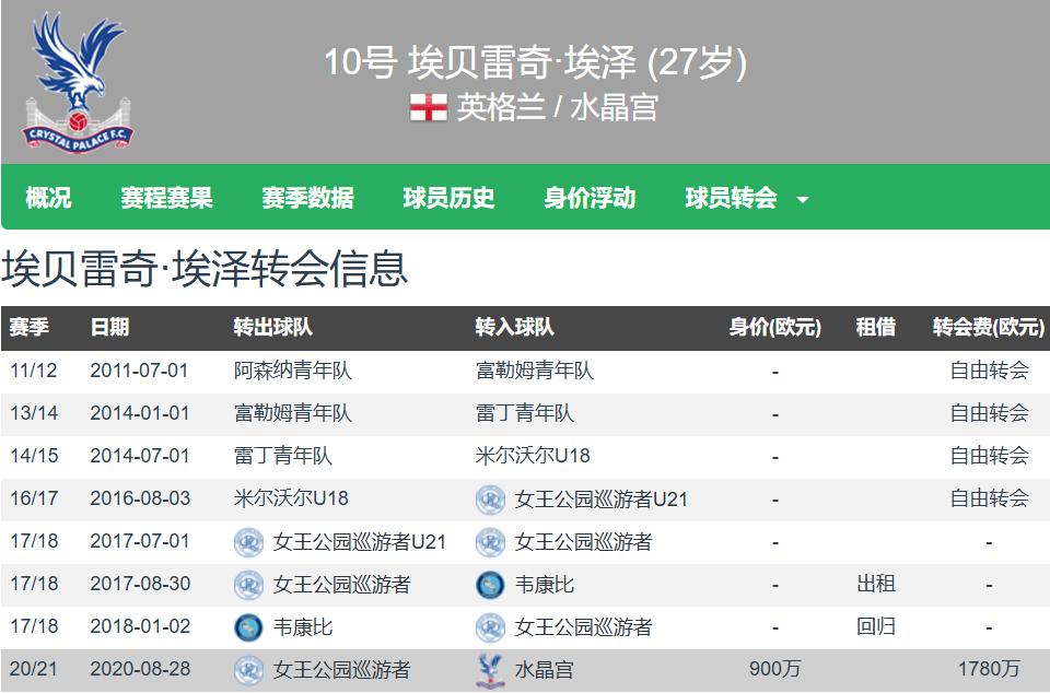 埃泽出自阿森纳青训,之后转投富勒姆以及雷丁青训,球员于2020年夏窗以1780万欧元的转会费从女王公园巡游者加盟水晶宫,于今水晶宫生计各项赛事167场40球28助,上赛季看成球队完全元勋捧起了足总杯冠军奖杯。