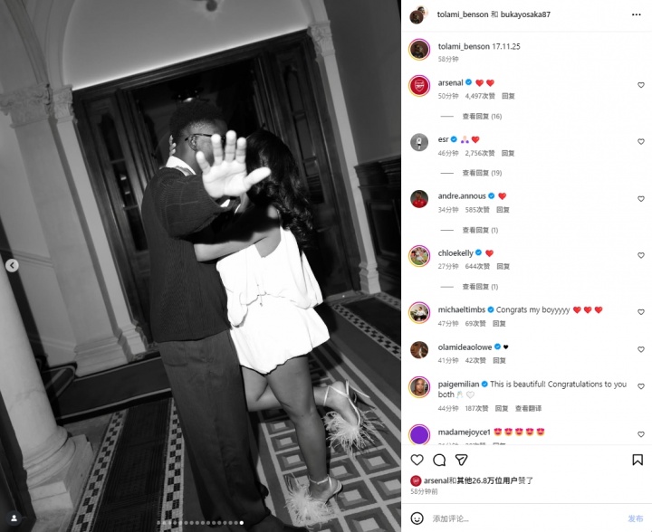 一小时前,阿森纳边锋萨卡在个东谈主社媒上晒出了一组吊祭滤镜的相片动态,告示了我方与女友托拉米订婚胜利的佳音。