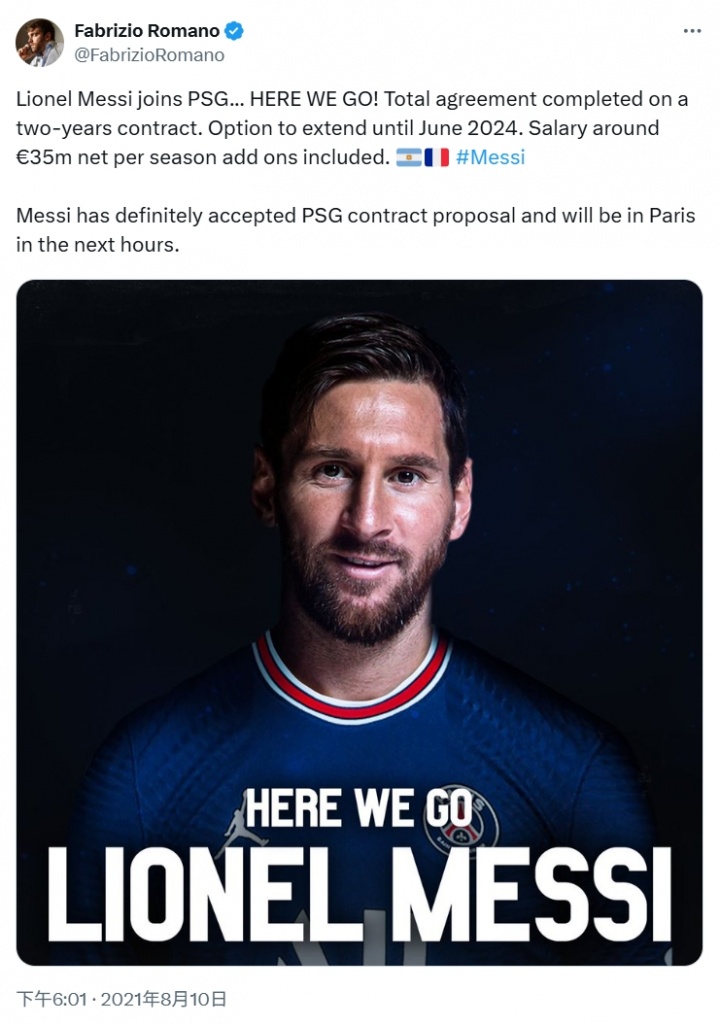 其时罗马诺的“Here We Go”↓三个半小时后巴黎官宣,立时梅西身穿“这里是巴黎”的T恤亮相机场。
