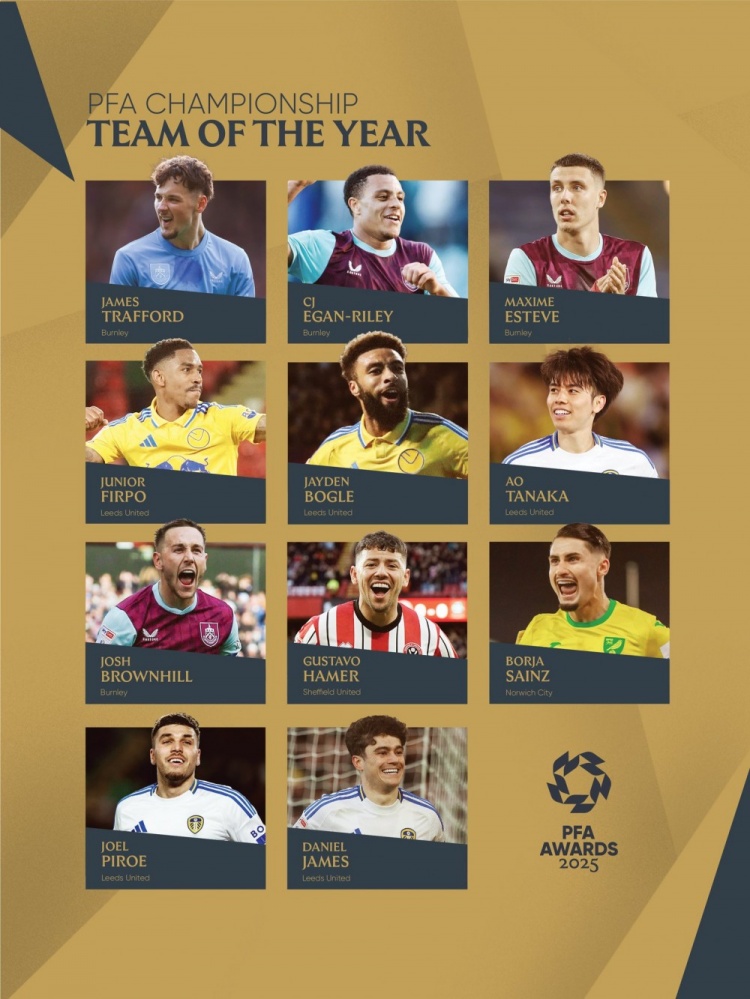 8月20日讯 昨日进行了PFA年度授奖仪式,仪式现场公布了由球员票选的2024/25赛季英冠联赛最好十一东说念主阵,现效能于利兹联的日本中场田中碧在列。