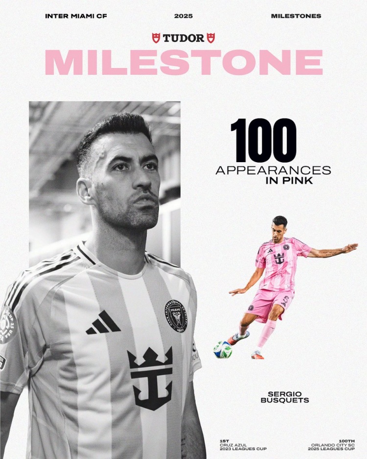 8月28日讯 定约杯半决赛,迈阿密国外3-1逆转奥兰多城晋级决赛,迈阿密官方晒海报道喜布斯克茨迎来100场里程碑。