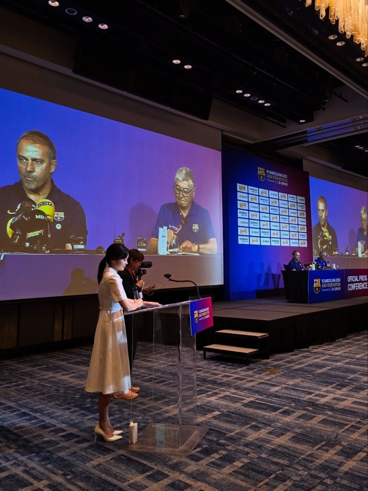 巴萨新闻发布会是由韩国好意思女主播张睿元专揽的,她还与巴萨主帅弗里克持手问候。