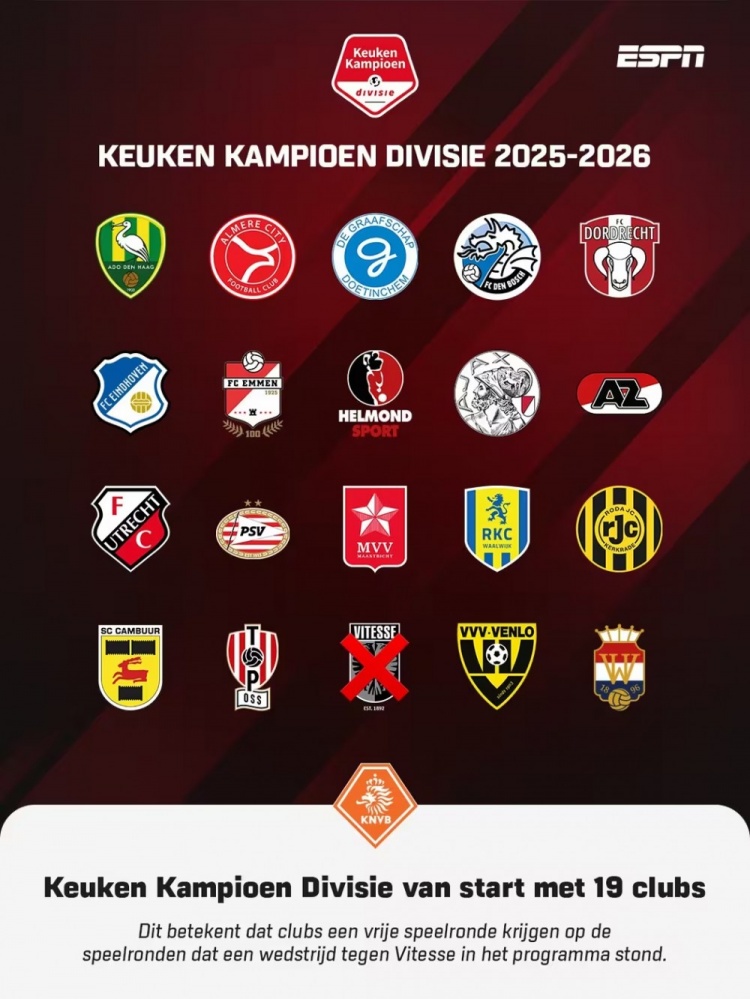 由于维特斯被进攻进入行状联赛,也不准荷甲球队后生队不详半行状、业余球队填补维特斯留住的空白,新赛季荷乙将只须19支球队。