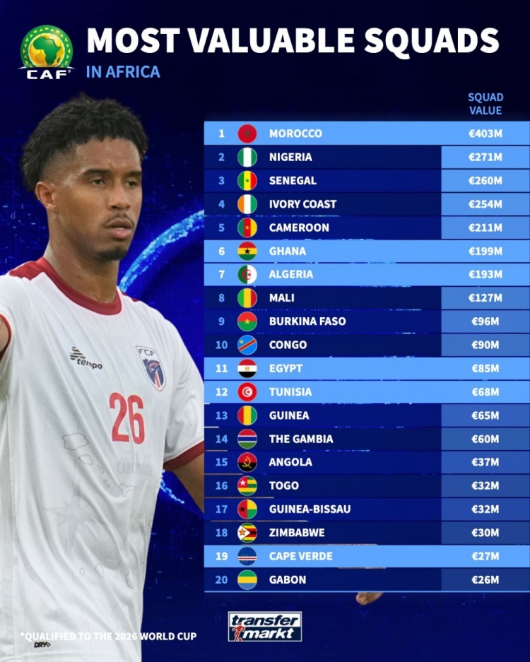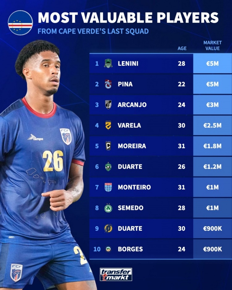 佛得角声威总身价2700万欧元,非洲球队之中仅排在第19位,而首位摩洛哥总身价高达4.03亿欧元。佛得角身价最高的球员为莱尼尼、皮纳,两东谈主德回身价均为500万欧元,仅8名球员身价达到100万欧或以上。