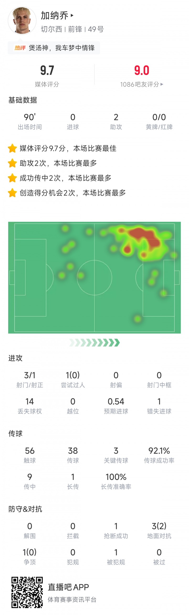 21岁的加纳乔刚加盟切尔西时合适得一般,阐扬并不算差但若何前6场比赛数据0球0助。好在加纳乔近期渐入佳境,坐稳首发的他近4场比赛2球2助,本场比赛更是拿到9.7的超高评分,全场第1。他此役56次触球14次丢球权,传球38次凯旋率92.1%,3次要津传球2次助攻,9次传中。
