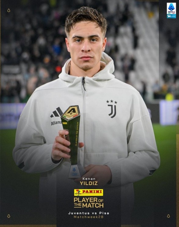 传球与射门配合建功,意甲官方:伊尔迪兹当选尤文4-0比萨整场最佳队员