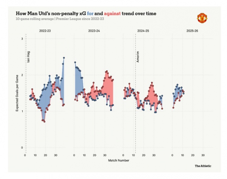 如下图表所示,曼联预期进球数据正稳步上升。虽距滕哈赫首季巅峰尚有差距,但长久赤字后已显现寂静蓝线,这也促成了帅位更替。