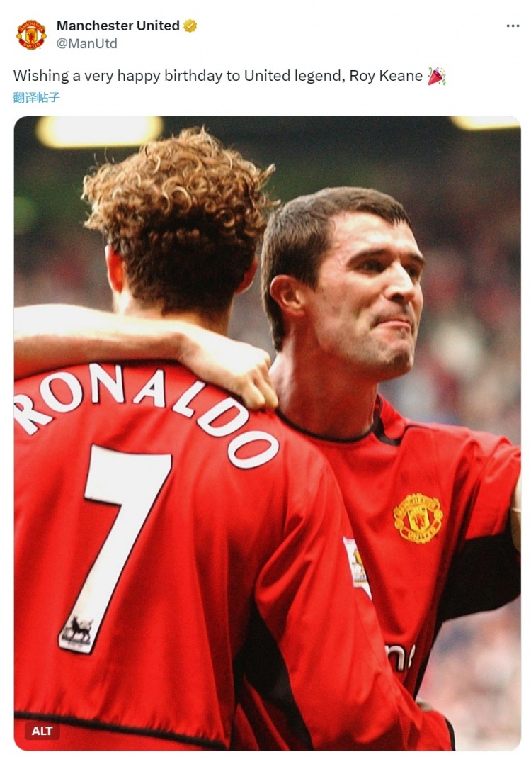 曼联官方社媒晒出罗伊-基恩效用球队时刻的相片,配文:“祝曼联传闻罗伊-基恩诞辰餍足。”