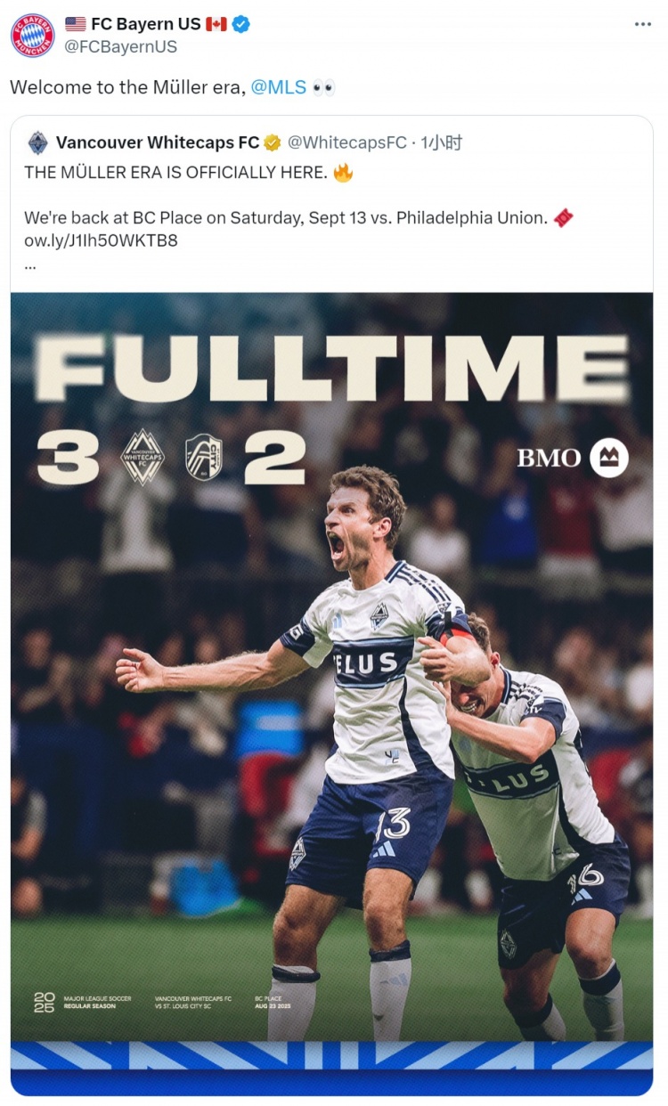 拜仁官方社媒转发温哥华白浪的海报,并@好意思职联,配文:“迎接来到穆勒时期。”