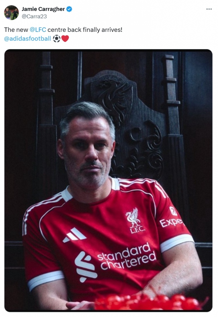 利物浦名宿、现考虑员卡拉格社媒晒图,他穿上了利物浦新赛季的主场球衣,而况配文:利物浦的新中卫终于到位了!