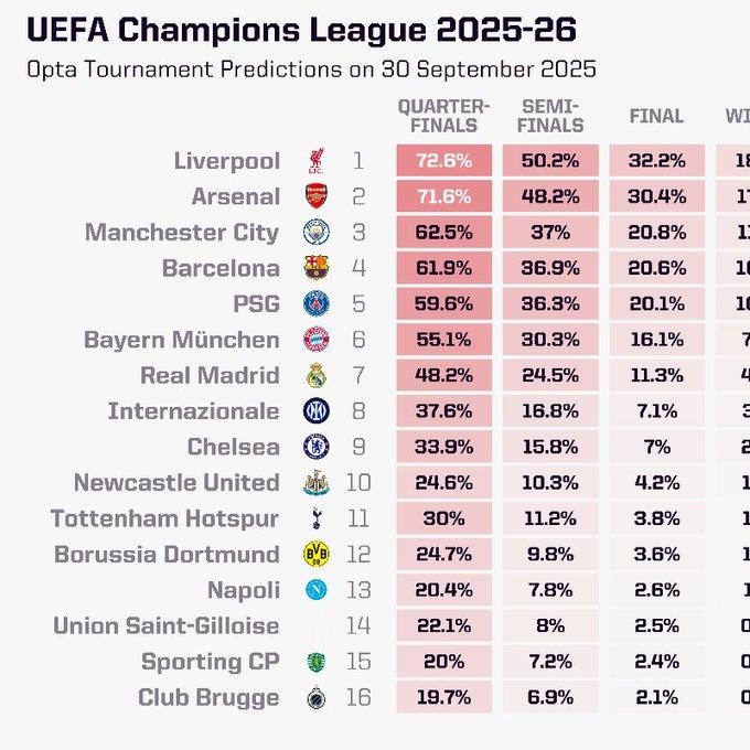 直播吧09月30日讯欧冠联赛阶段第二轮开赛在即,opta超等筹画机更新了欧冠夺冠概率,其中利物浦位列榜首,阿森纳、曼城分列二三。
