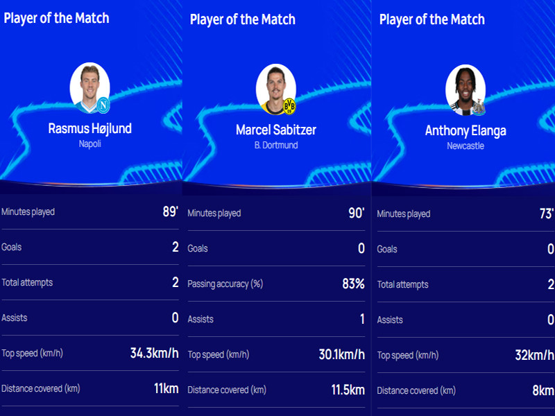 先望望全场最好,字据欧足联官网发布的信息,来自那不勒斯的霍伊伦,多特蒙德的萨比策,还有纽卡斯尔的埃兰加,三名曼联旧将,赛后皆被评比为全场最好。同期,三支球队均迎来欧冠的首场得手,首轮补时连丢两球,失去2分的多特蒙德,依然高潮到积分榜的前八名。