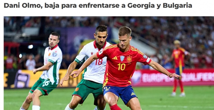 达尼·奥尔莫将因伤无法参预在埃尔切对阵格鲁吉亚及在巴利亚多利德对阵保加利亚的比赛。
