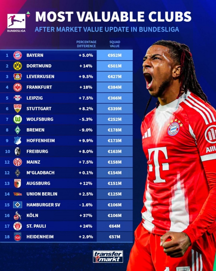 10月15日讯 德转更新了德甲身价,以下为更新后德甲各队身价名次: