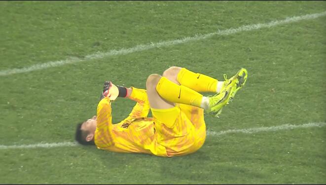 10月25日讯 亚泰补时先丢一球后,门将王智峰拖延时辰染黄,随后他暴露抽筋被裁判警戒!