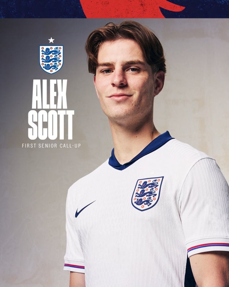 英格兰队公布新一期名单,伯恩茅斯22岁中场斯科特初度入选,英格兰队官方社媒晒出斯科特的海报,对他暗示道喜。