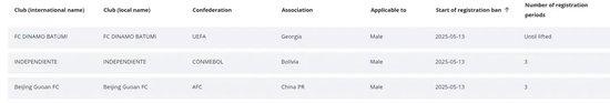 据外洋足联转会注册禁令败露系统:北京国安被处以3个转会窗的转会禁令科罚。字据外洋足联公布的信息,该禁令更新于2025年5月13日。